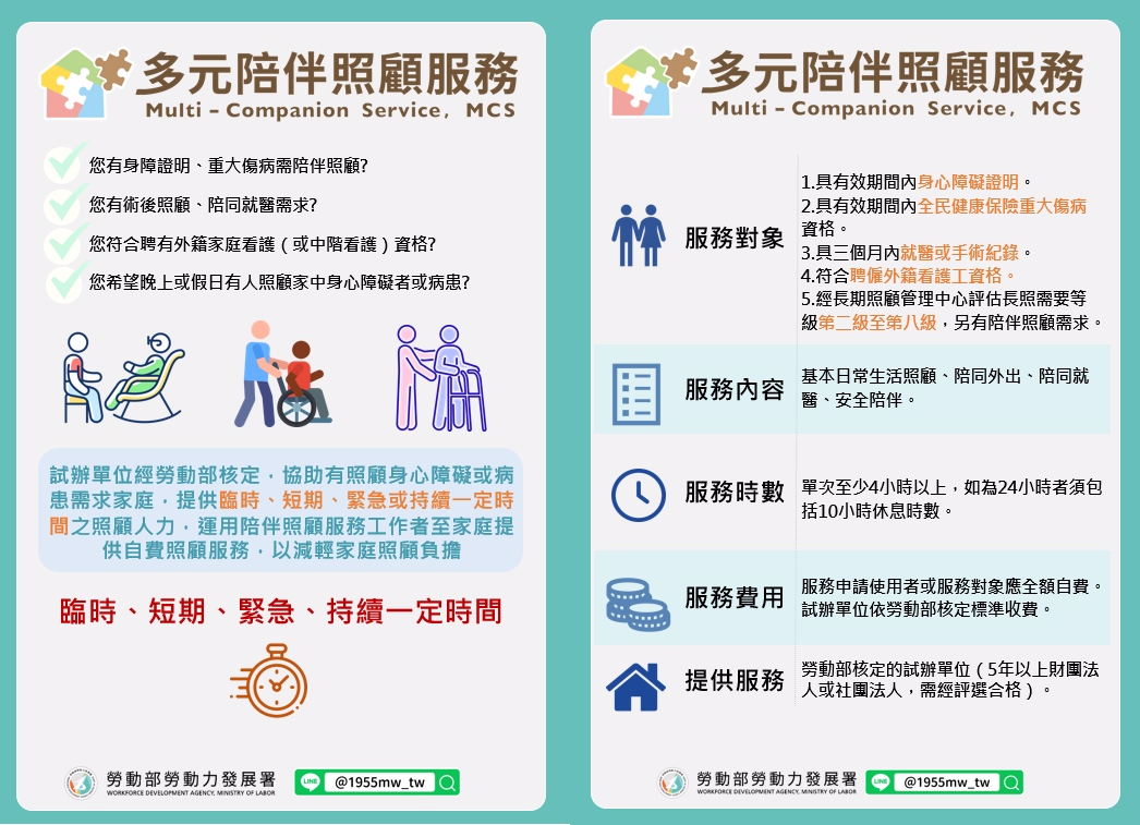 為回應民眾「臨短急」照顧需求,包括長輩「臨」時有狀況卻找不到照顧人力、外籍家庭看護空窗期的「短」期需要照顧人力、家人手術或病後需要「急」性後期照顧等。勞動部今年底前將推動「多元陪伴照顧服務試辦計畫」,由成立5年以上具有服務實績的財團法人或公益社團法人為雇主,聘用本外籍陪伴照顧服務工作者,至家有身心障礙者或病患的家庭,協助家中需要陪伴照顧的服務對象,提供基本日常生活照顧、陪同外出、陪同就醫、安全陪伴等陪伴照顧服務,歡迎符合資格的團體申請成為試辦單位。