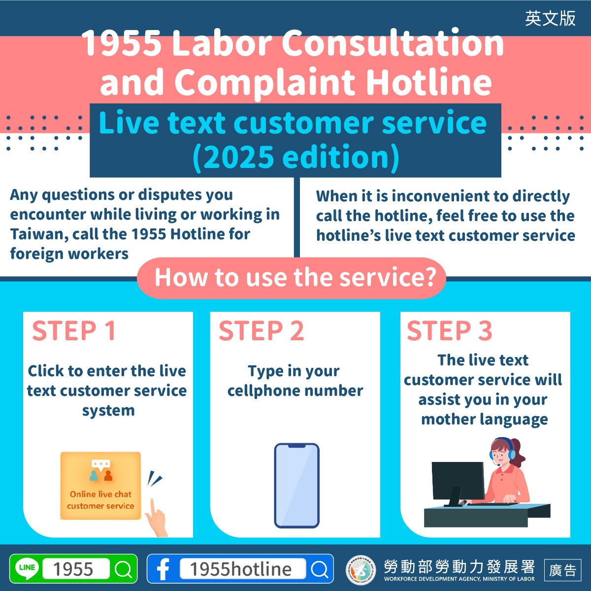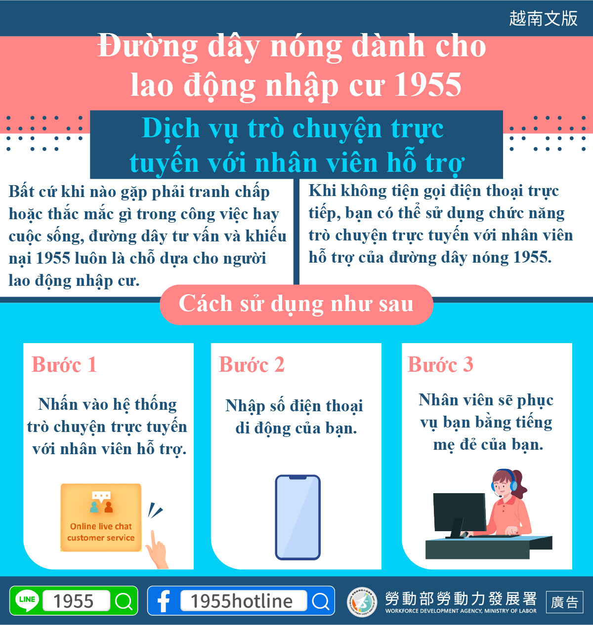 Any questions or disputes you encounter while living or working in Taiwan, call the 1955 Hotline for foreign workers