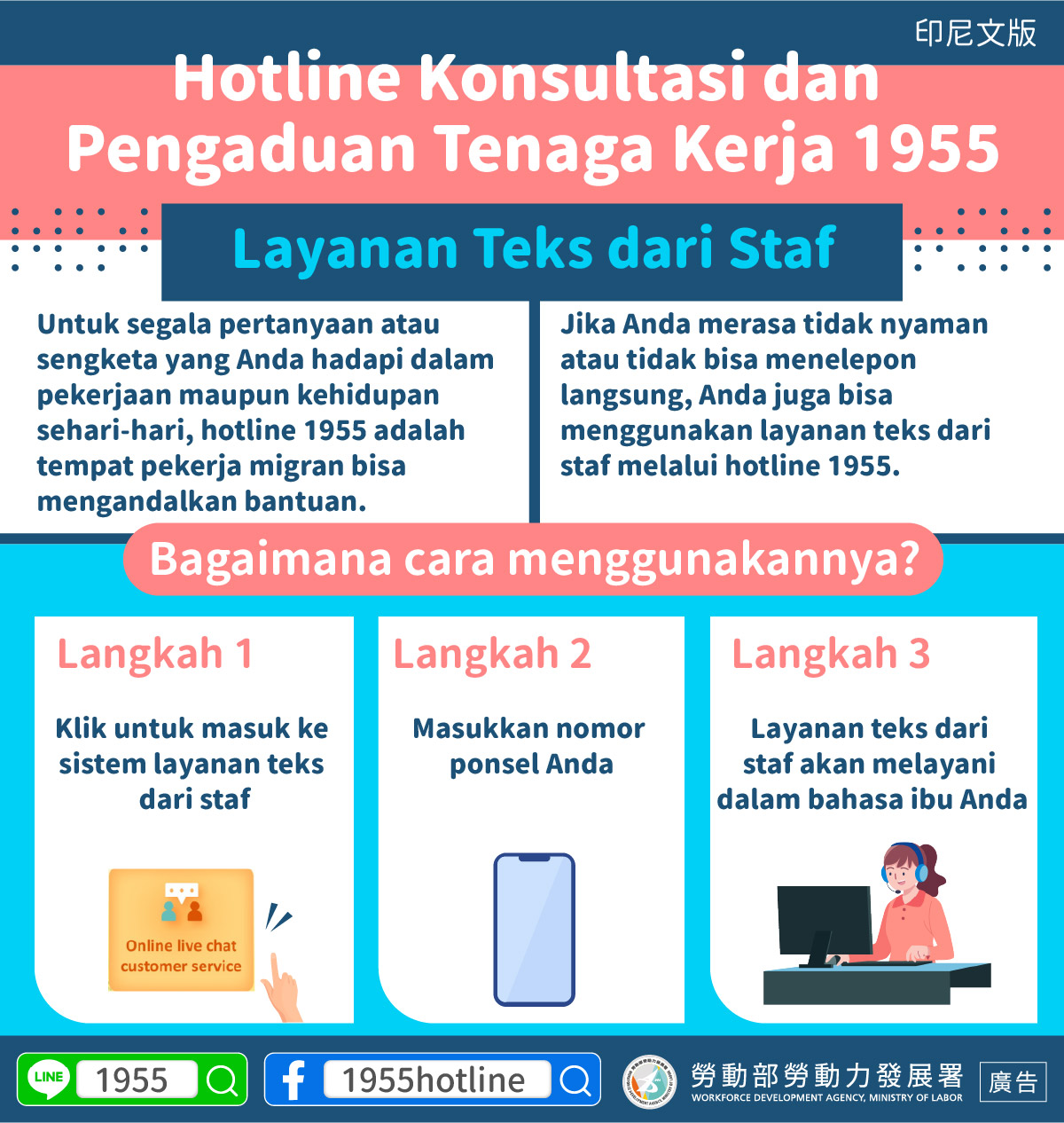 Untuk segala pertanyaan atau sengketa yang Anda hadapi dalam pekerjaan maupun kehidupan sehari-hari, hotline 1955 adalah tempat pekerja migran bisa mengandalkan bantuan.