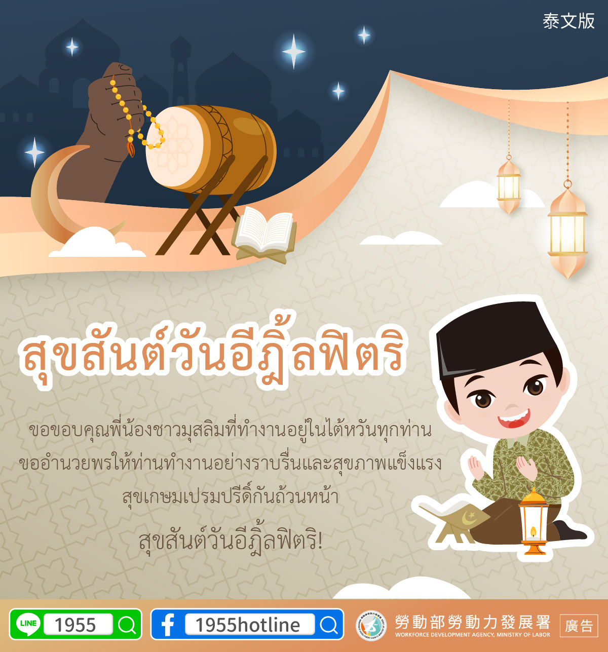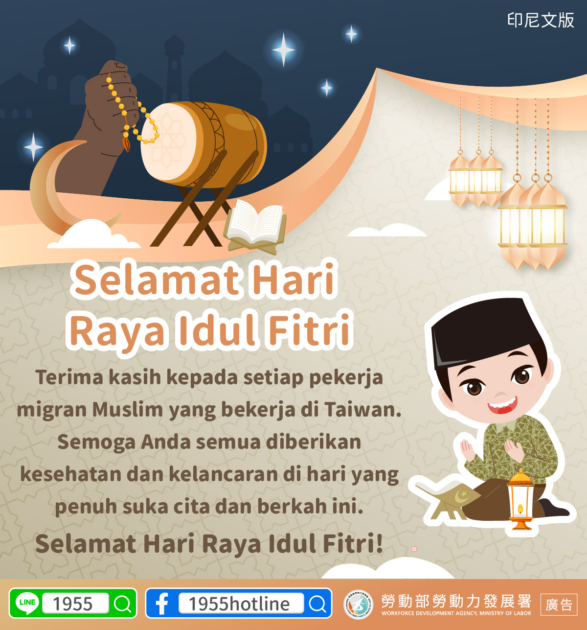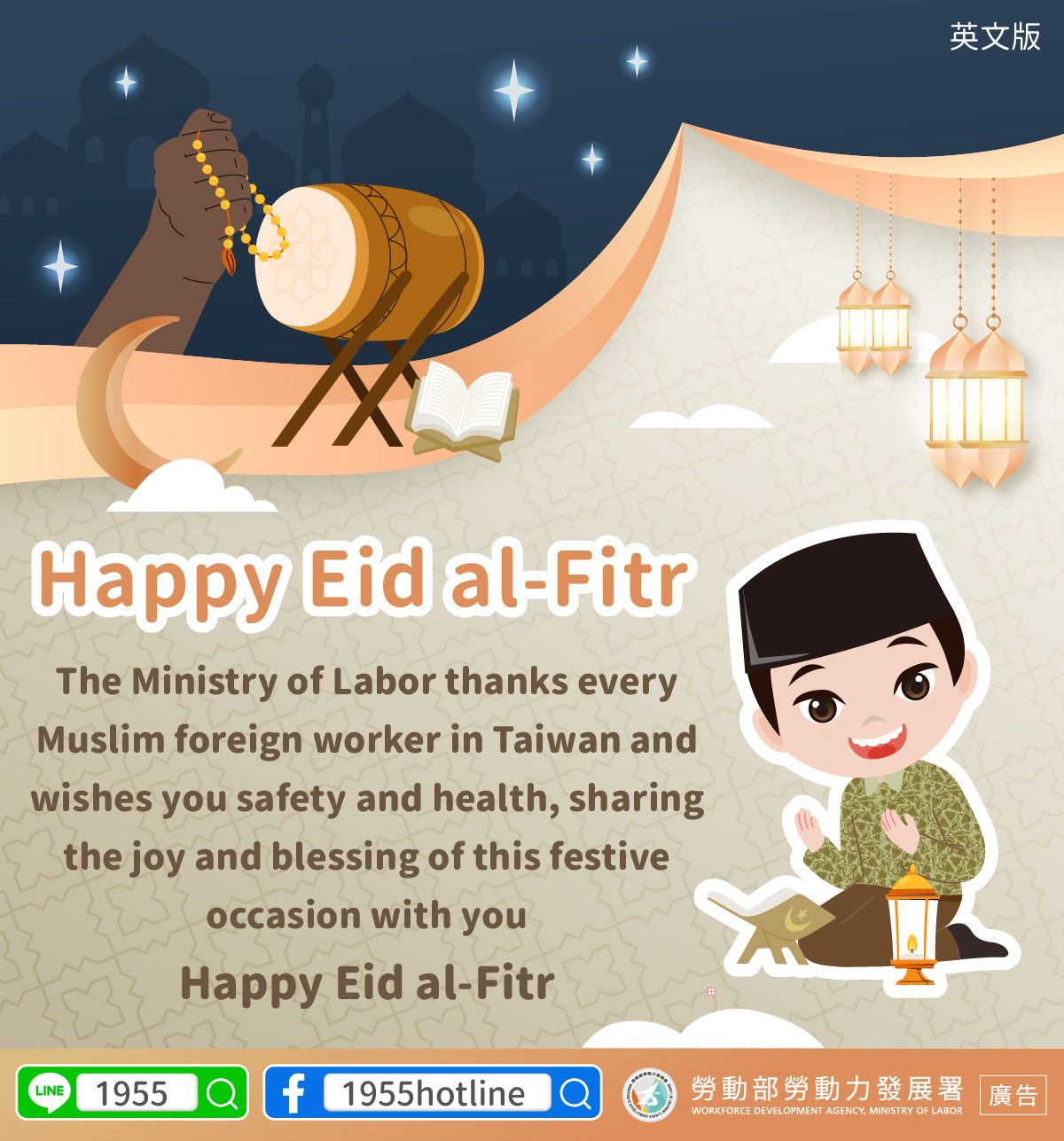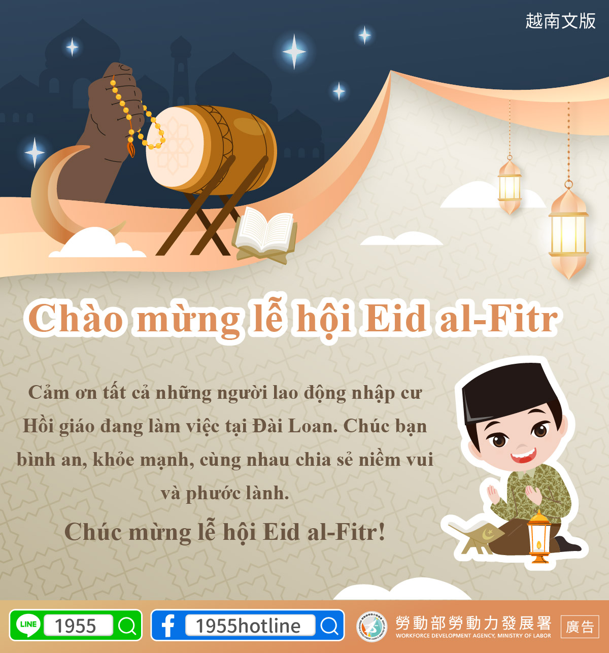 The Ministry of Labor thanks every Muslim foreign worker in Taiwan and wishes you safety and health, sharing the joy and blessing of this festive occasion with you
